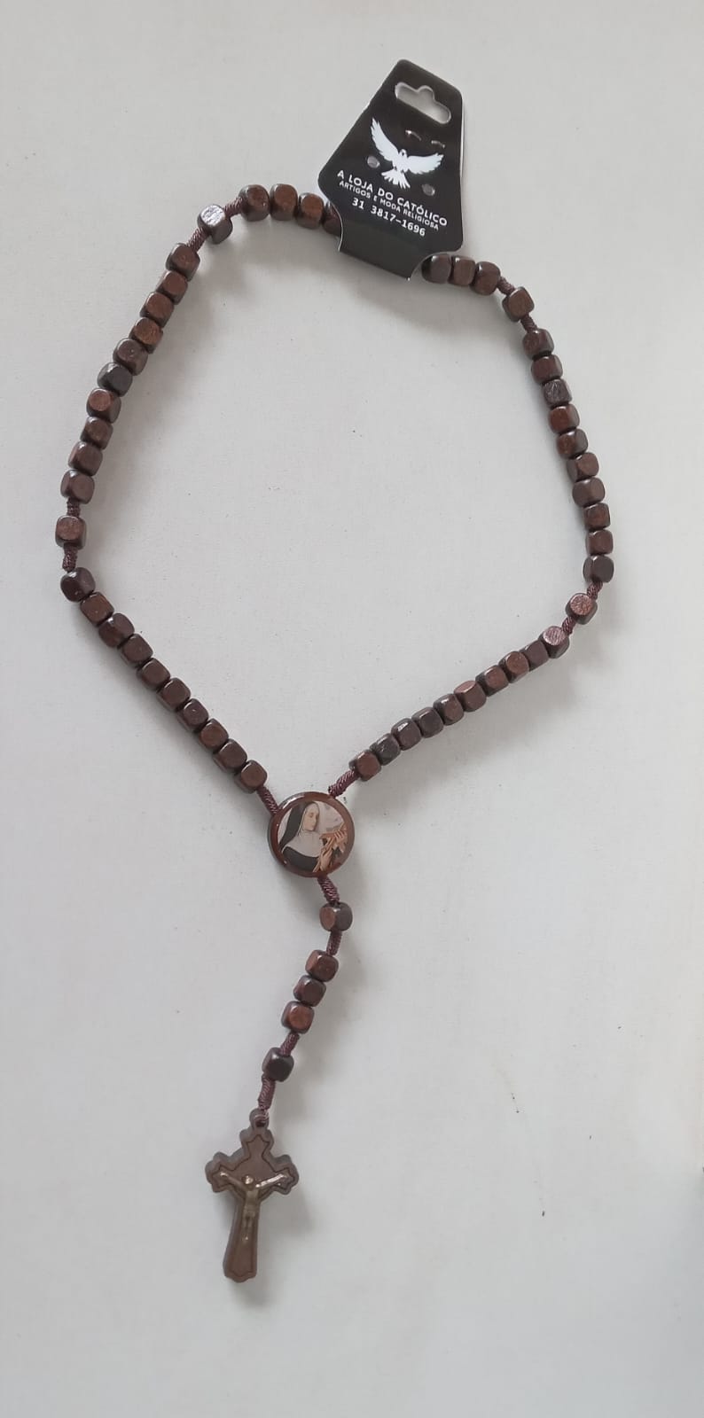 Descrição: Terço Madeira Conta Quadrada Santa Rita